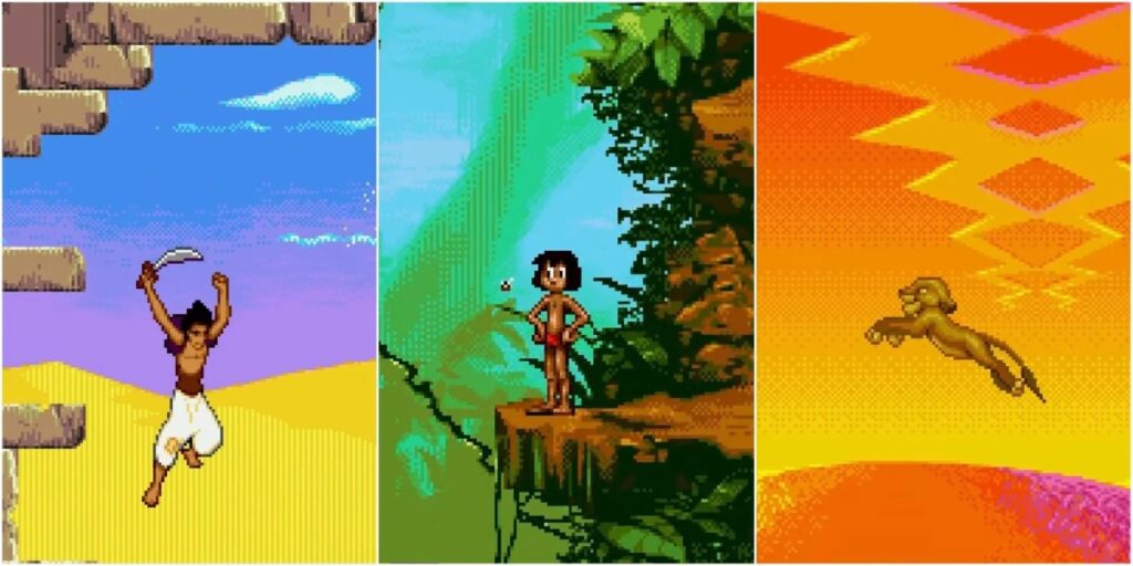 Aladdin, em particular, é lembrado por sua fluidez de animação, cortesia da equipe da Virgin Games, que capturou com perfeição os movimentos do herói titular com uma técnica inovadora na época. Os jogadores podiam balançar suas espadas, saltar por telhados de Agrabah e até mesmo usar o tapete mágico em fases emocionantes. O Rei Leão, por sua vez, é notoriamente conhecido por seu alto nível de dificuldade, apresentando fases com desafios intrincados que testavam a paciência e a habilidade dos jogadores ao longo da jornada de Simba do filhote travesso ao rei da selva. Ambos os títulos representam um marco na história dos videogames licenciados e continuam sendo referência para o gênero.